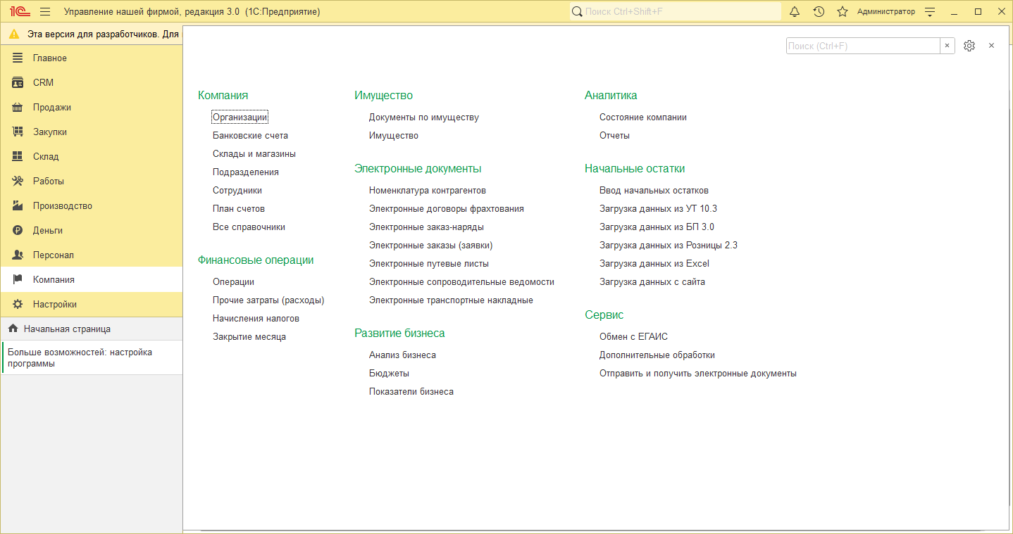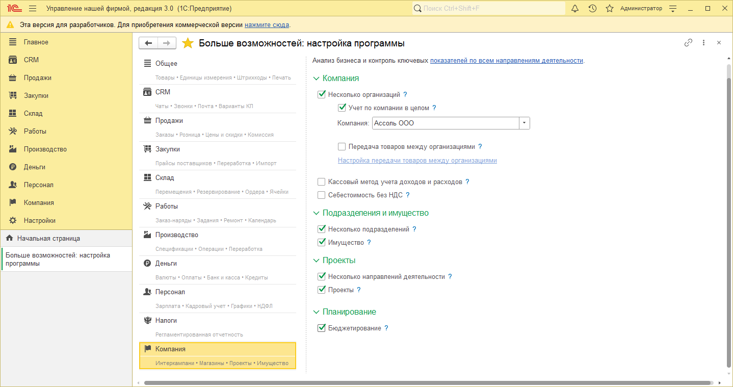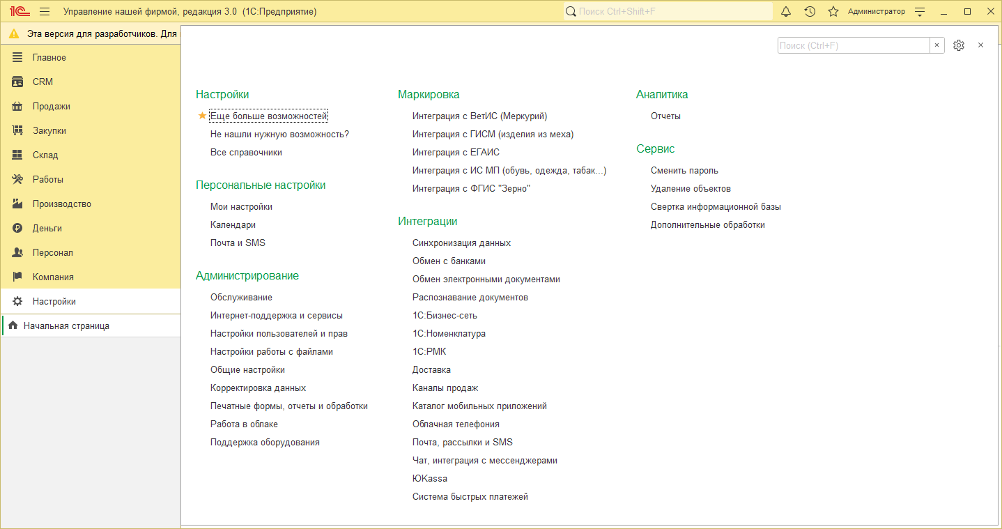 - Готовая интеграция с другими разделами (закупки, продажи).