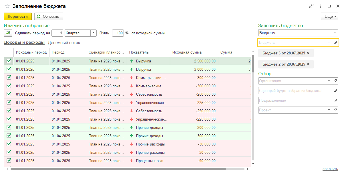 И в появившемся окне выбрать бюджеты, из которых вы хотите взять данные: