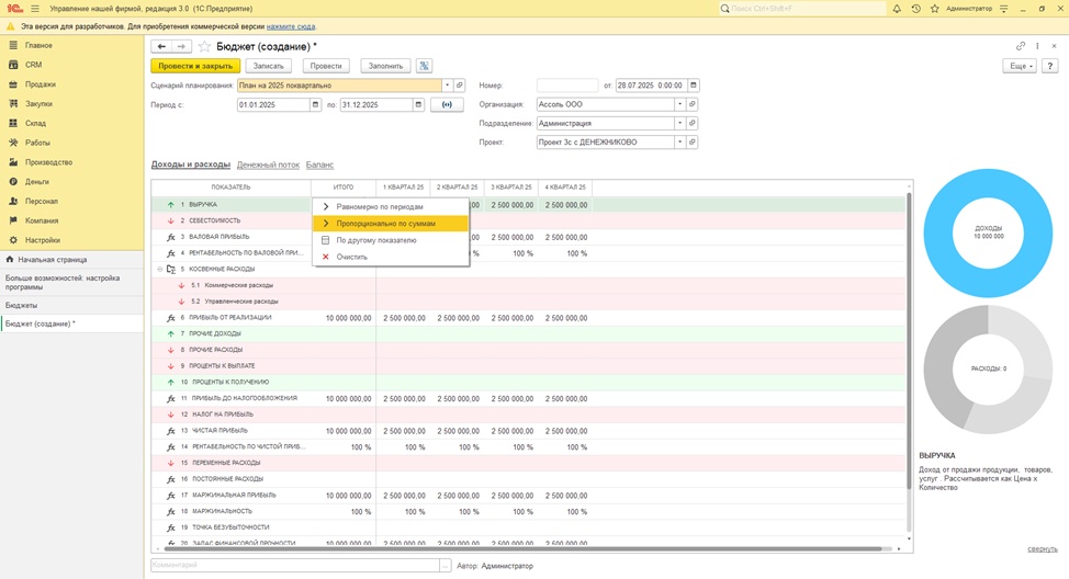 - пропорционально по суммам— это способ планирования позволит вначале указать доли (проценты) распределения по периодам, после чего годовая сумма распределяется пропорционально указанным значениям долей;