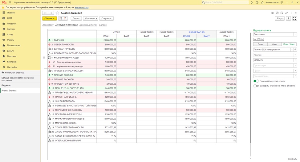 Когда фактические данные получены, можно составить отчеты план-факт. Чтобы сформировать отчет план-факт в 1С: Управление нашей фирмой необходимо перейти в раздел Компания – Анализ бизнеса. В результате в сформированном отчете мы увидим две колонки ПЛАН и ФАКТ с указанием данных плановых и фактических показателей финансового планирования.