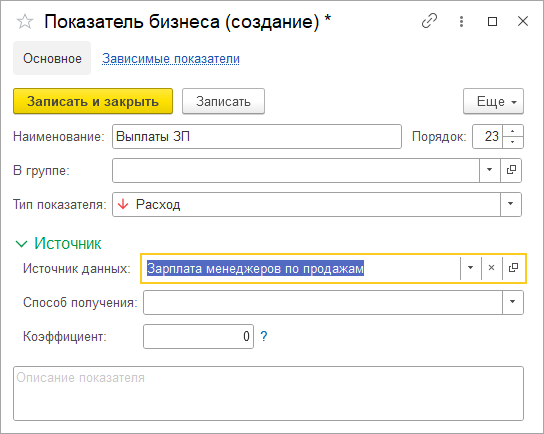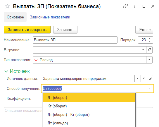 При создании показателя бизнеса также важно помнить про способ получения по выбранному счету: