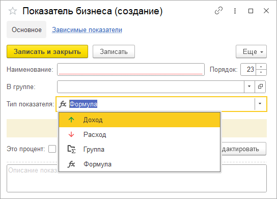 Для примера создадим показатель бизнеса. При создании можно выбрать тип показателя: «Доход», «Расход», «Группа» и «Формула»: