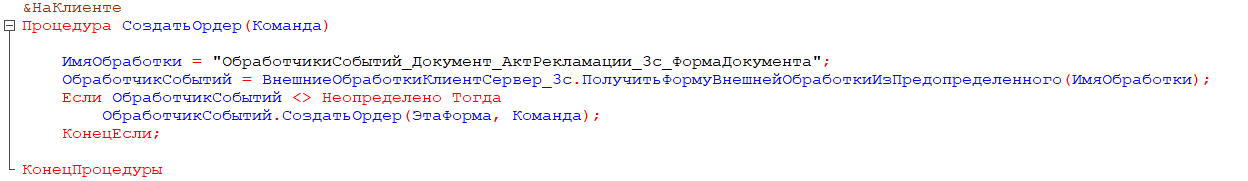 Логика работы новой кнопки будет обрабатываться в модуле формы документа-основания. В процедуре-обработчике нажатия кнопки (на клиенте) мы вызываем метод внешней обработки, которая и будет управлять всем процессом.