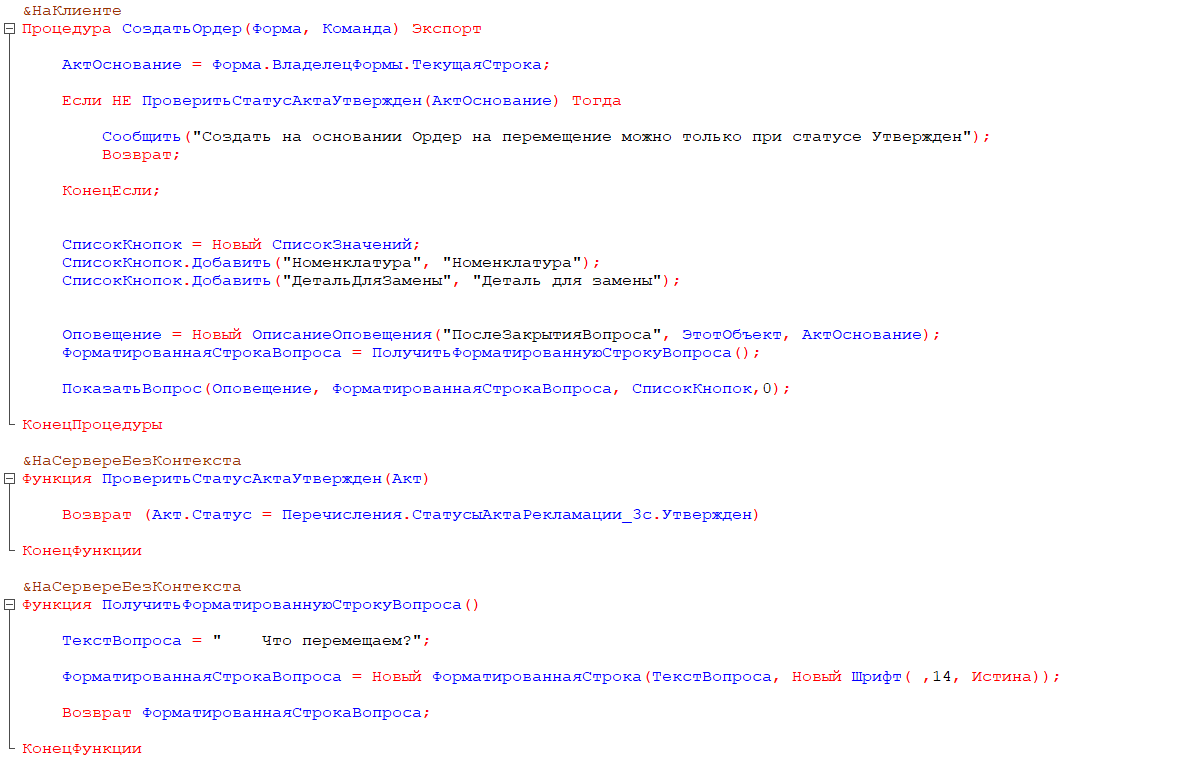После того как пользователь сделает выбор и нажмет кнопку «ОК», управление перейдет к процедуре «ПослеЗакрытияВопроса». В этой процедуре (уже на сервере) выполняется следующее: