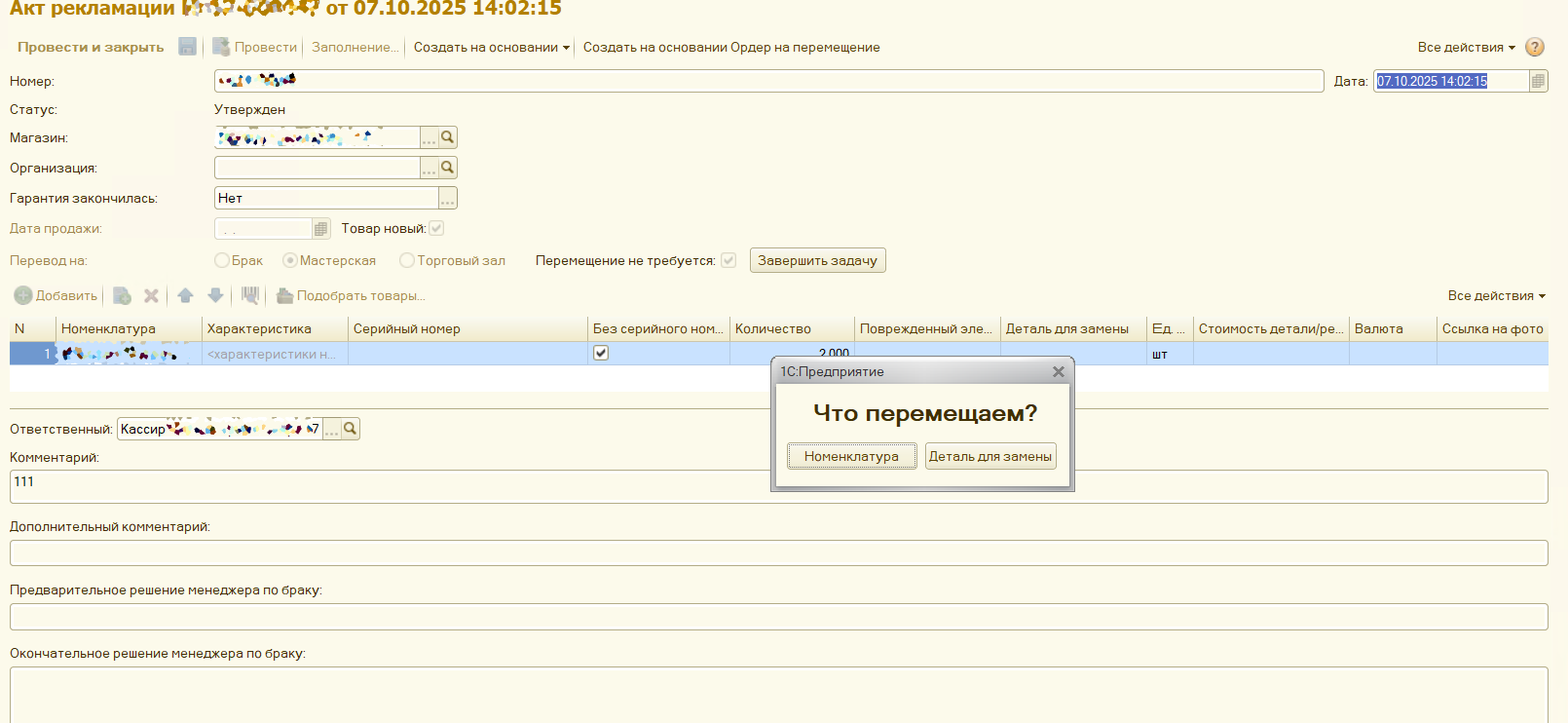 Например, если пользователь выбрал опцию «Переместить бракованные товары», в табличную часть «Ордера на перемещение» будут перенесены только позиции, отмеченные в акте рекламации как брак. Если же был выбран вариант «Переместить товары для утилизации», то заполнение пойдет по другому алгоритму.