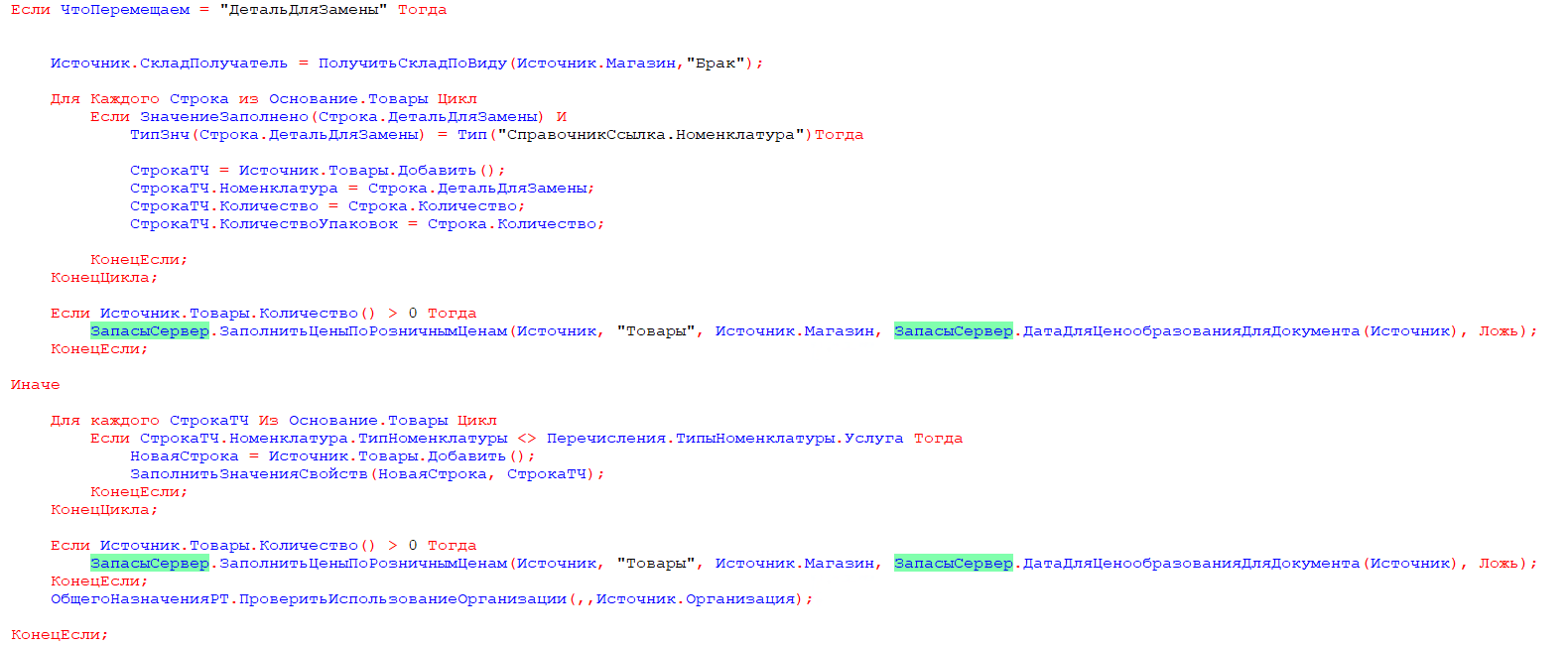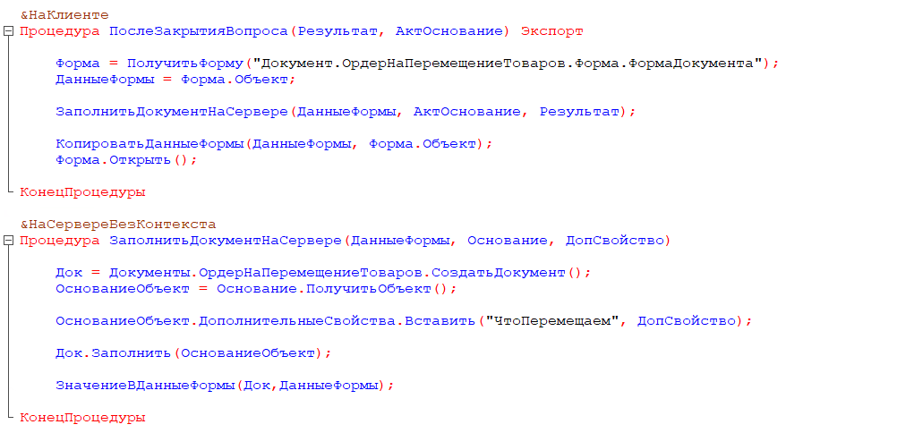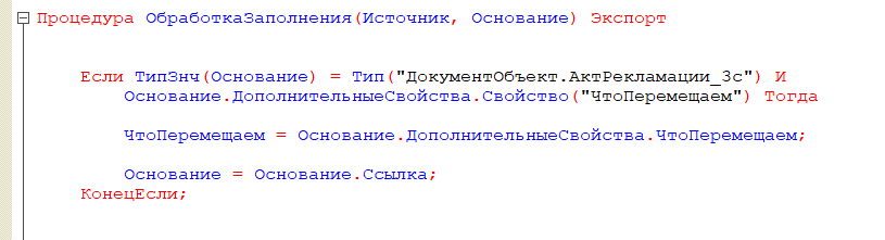 Здесь мы извлекаем значение выбора пользователя из «ДополнительныеСвойства» и, в зависимости от него, заполняем документ-приемник нужными данными из документа-основания.