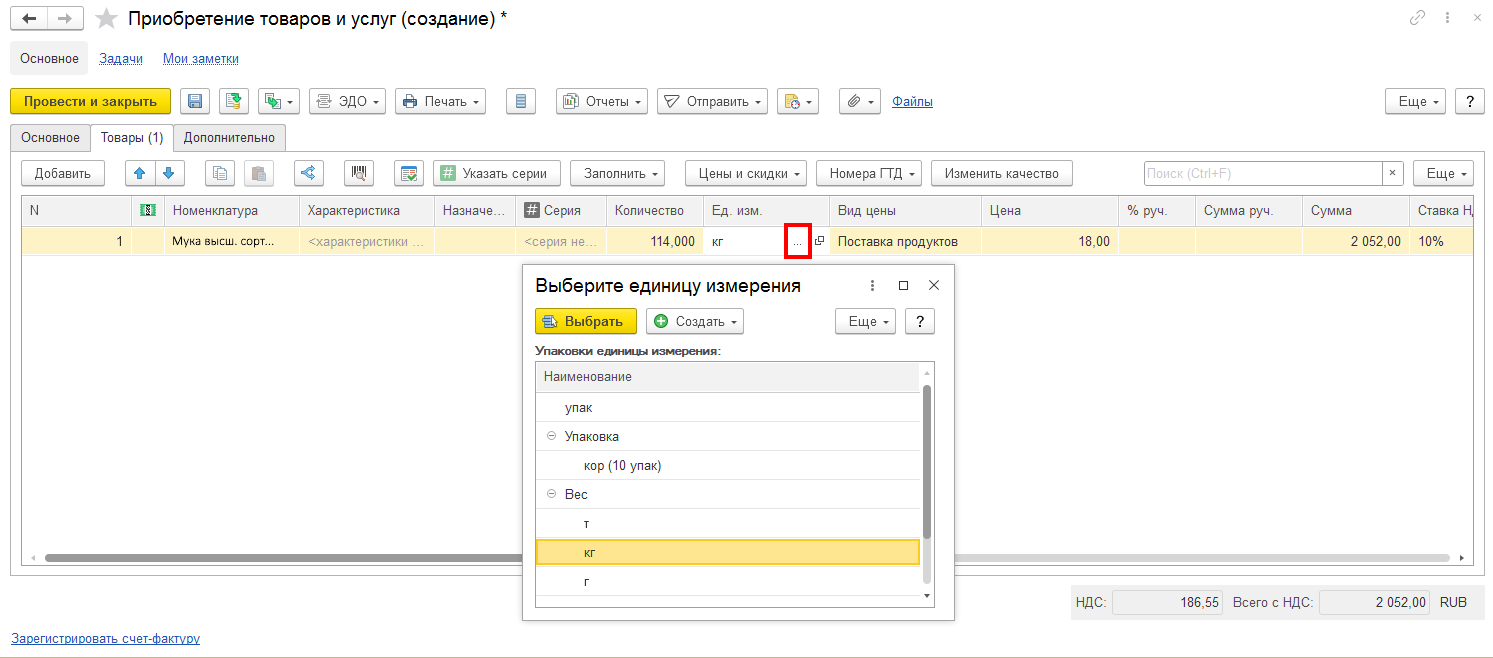 - Выбираем единицу измерения — кг.