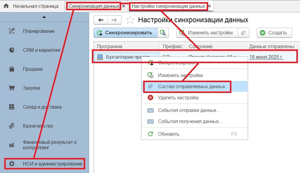 - Откройте «НСИ и администрирование» → «Синхронизация данных».