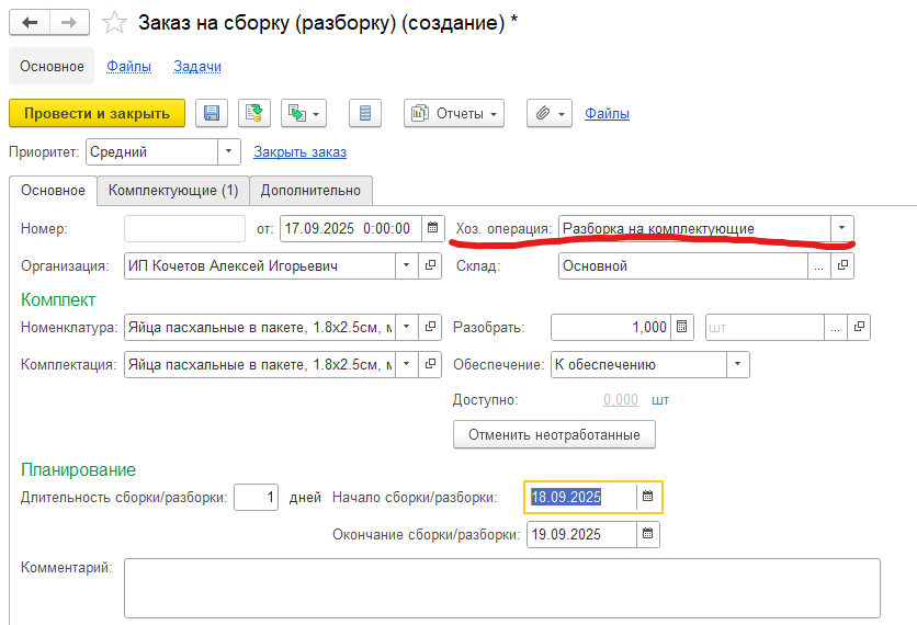 Из журнала складских документов создайте сборку с видом операции «Разборка на комплектующие».