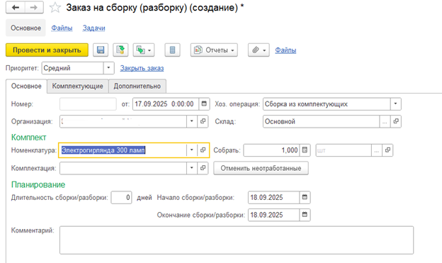 На вкладке «Основное» укажите реквизиты: организацию, склад, выберите комплект и количество собираемых комплектов. Обязательно заполните даты начала и окончания сборки. Для планирования поступления готовых комплектов на склад добавьте длительность операции и желаемую дату поступления.