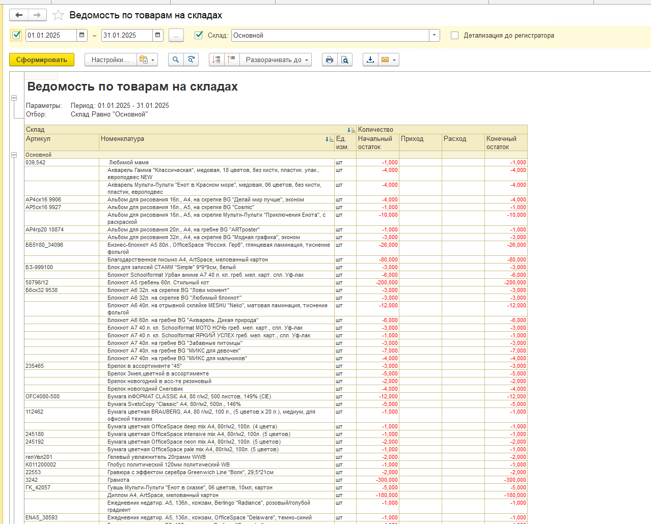 Сформируйте отчёт по складу. Вы увидите, что все товарные движения фактически осуществлены.