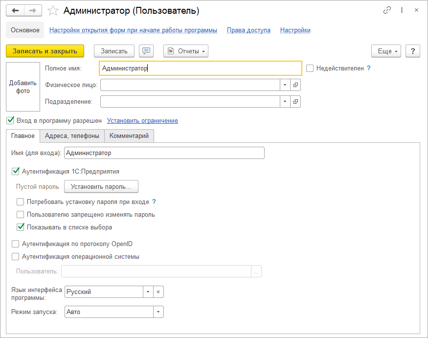 Настройка учетной записи администратора в «1С:Предприятие 8»