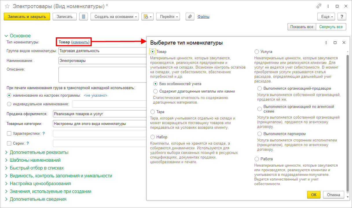 Классификация элементов в справочнике «Номенклатура» (товар, услуга или работа) зависит от типа, который задается для каждой позиции в справочнике «Виды номенклатуры».