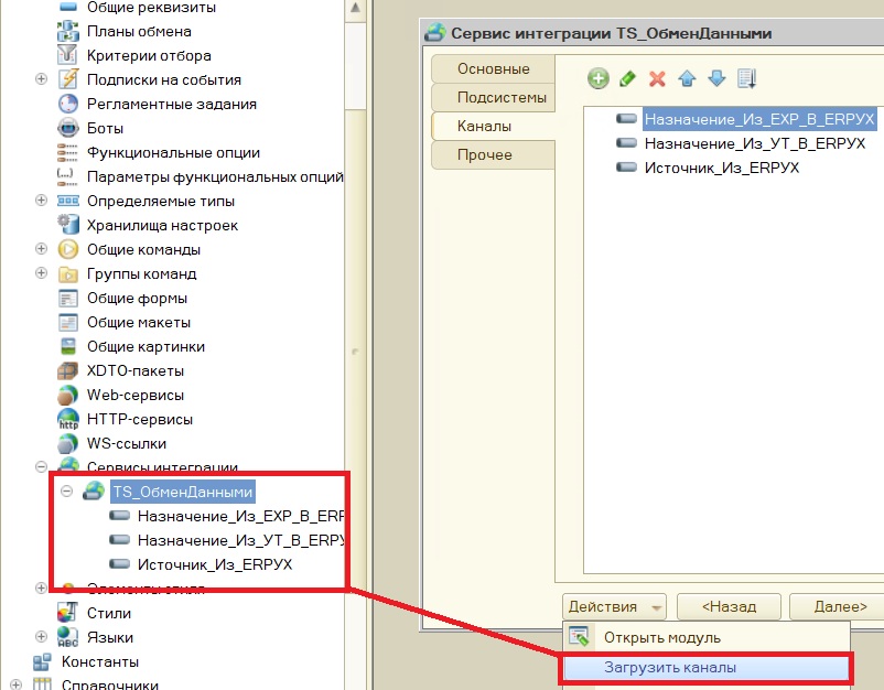 6. Далее стоит изменить СервисИнтеграции в конфигураторе, загрузить каналы из сервиса. Не забудьте перед загрузкой удалить прошлые каналы.