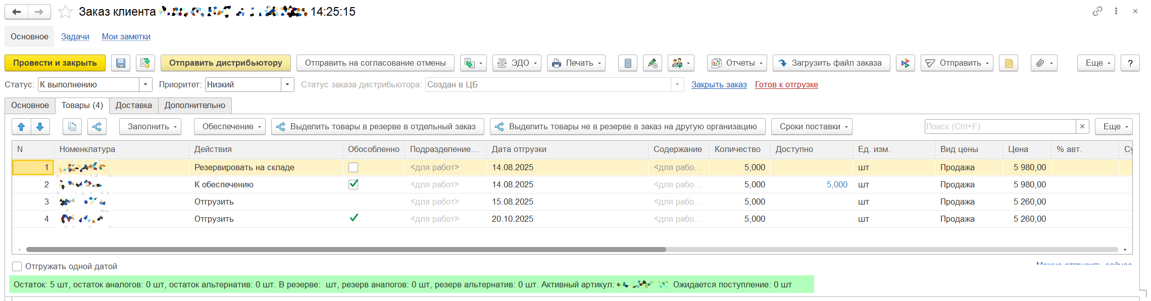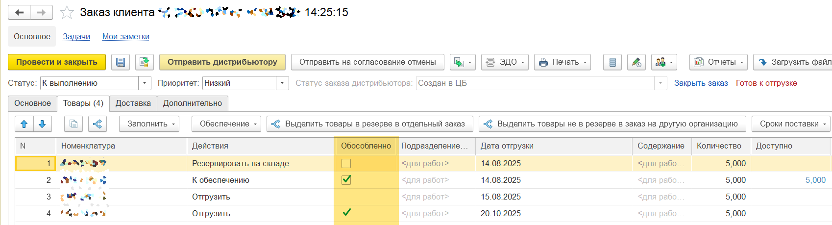 В исходном заказе клиента статус меняется с «Отгрузить» на «Отгрузить обособленно».
