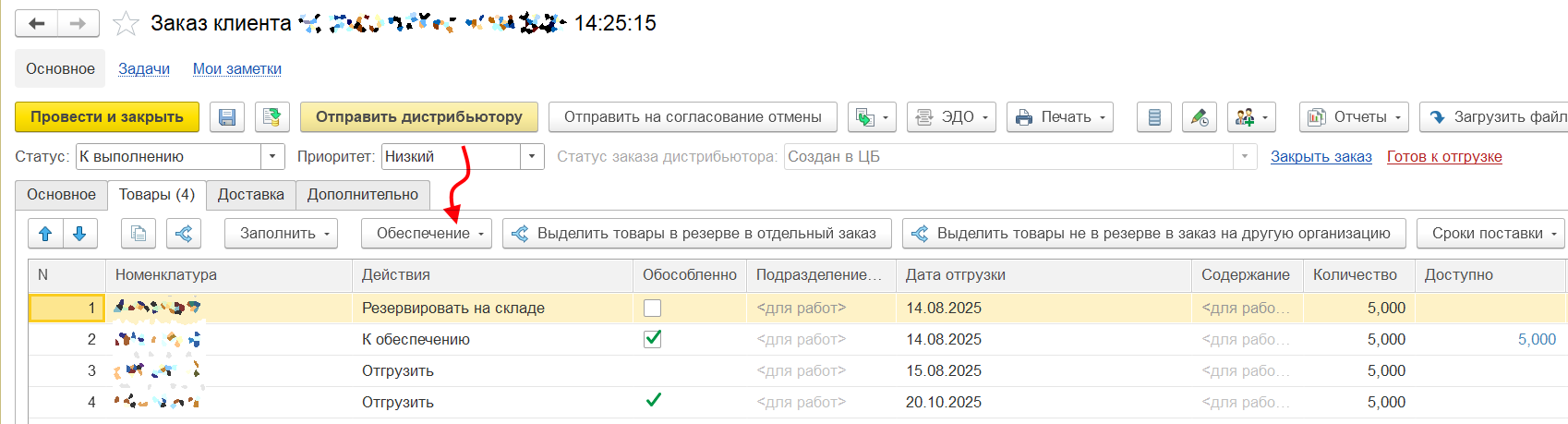 Важно: товары с действиями «Резервировать на складе» и «Резервировать по мере поступления» нельзя скорректировать напрямую. Сначала нужно изменить действие в документе на «К обеспечению».