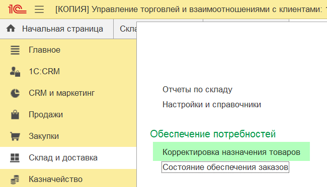 Если клиент отказался от покупки, нужно освободить зарезервированный товар. Для этого используется документ «Корректировка назначения товаров».