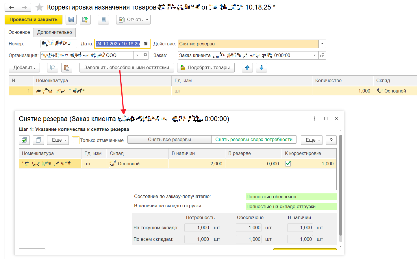 В механизме обеспечения складских потребностей существует важный нюанс: когда складской остаток формируется за счёт потребностей из разных заказов, он становится общедоступным. Это значит, что товар может быть отгружен не только по тем заказам, которые изначально создали потребность, но и по любым другим документам.
