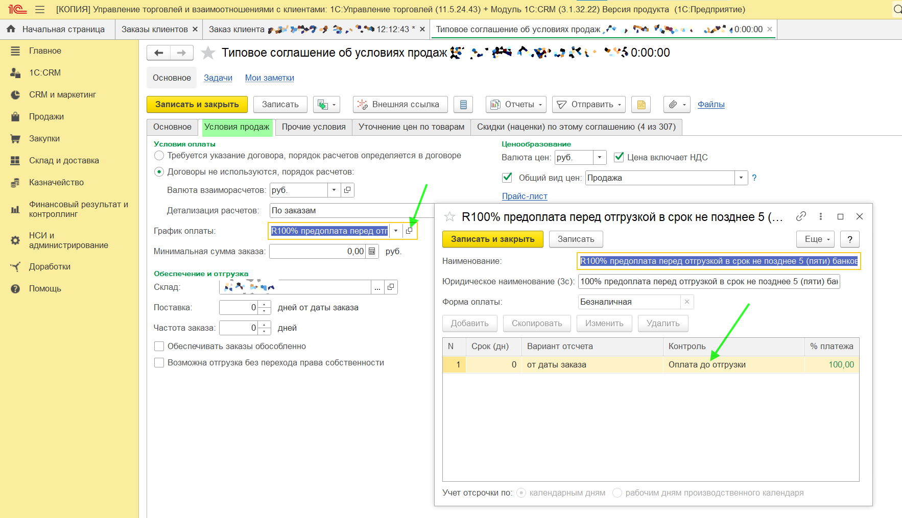 - В Соглашении – Условия продаж – График оплаты – Контроль прописываются условия отгрузки номенклатуры после оплаты заказа.