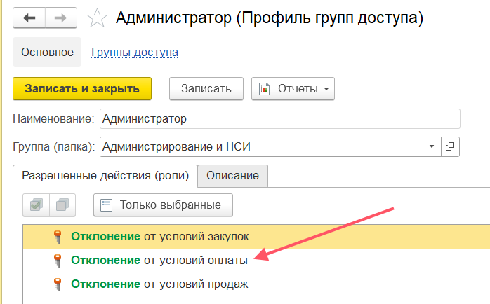 Для таких случаев в 1С предусмотрен специальный механизм — роль «Отклонение от условий оплаты».