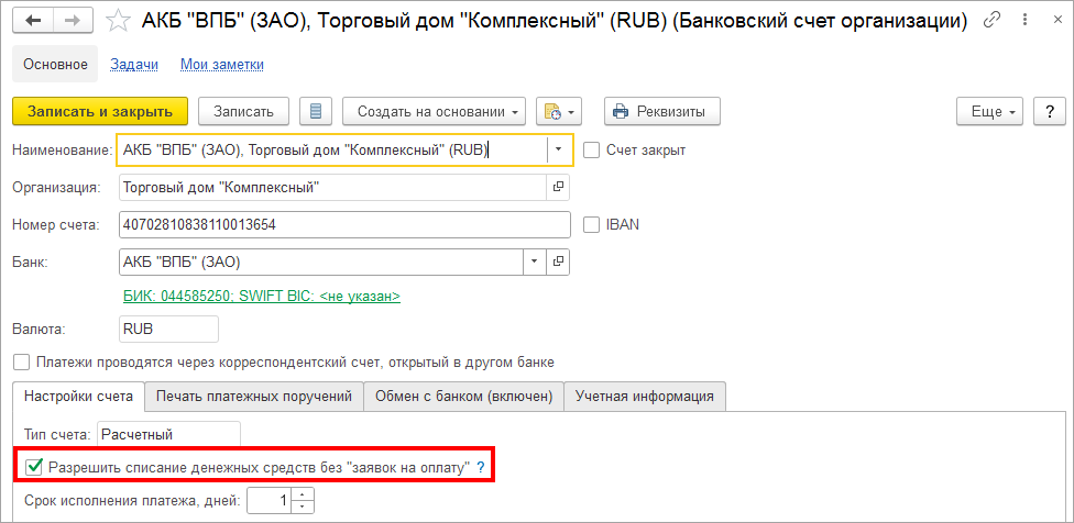 При включении контроля флажок Разрешить списание денежных средств без «заявок на оплату» не устанавливается, что обеспечивает дополнительный контроль над движением денежных средств.