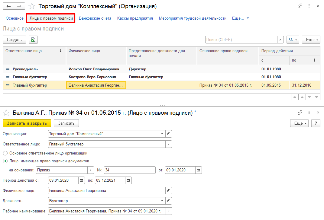 Хранится информация о документах, дающих право подписи.