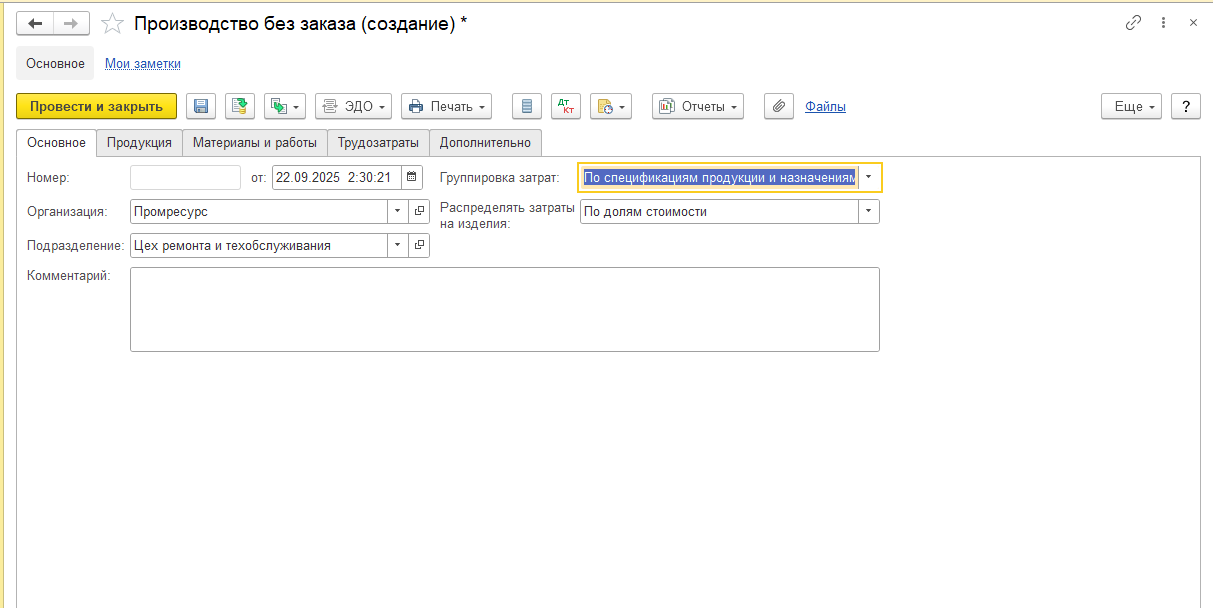 Документ Производство без заказа предназначен для отражения производства продукции или работ и списания материалов с баланса складов и цеховых кладовых, а также работ с баланса подразделений, и их отнесения на выпущенную продукцию.