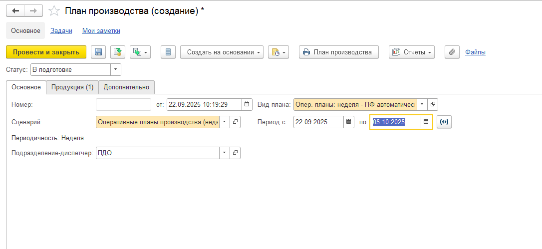 - Вид плана. В графе указывается источник для плана производства. В примере это заказы клиентов.