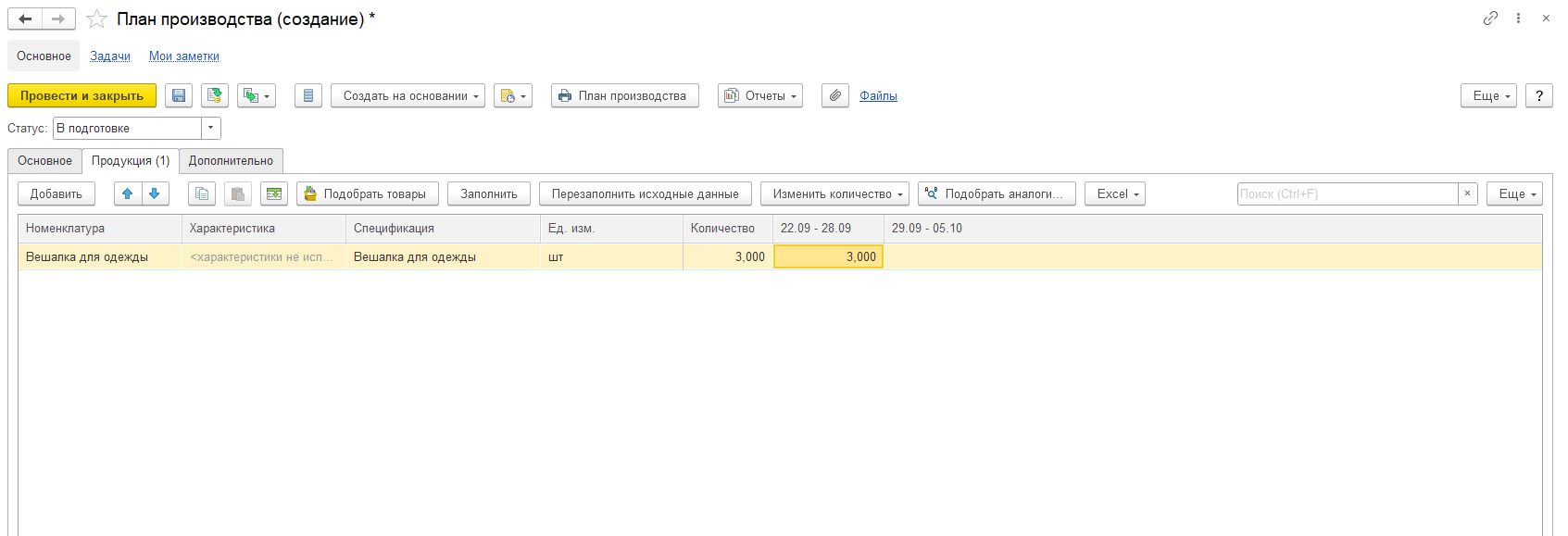 Соответственно, если сдвинуть период, то в документе «План производства» отразится продукция из четвертого заказа.