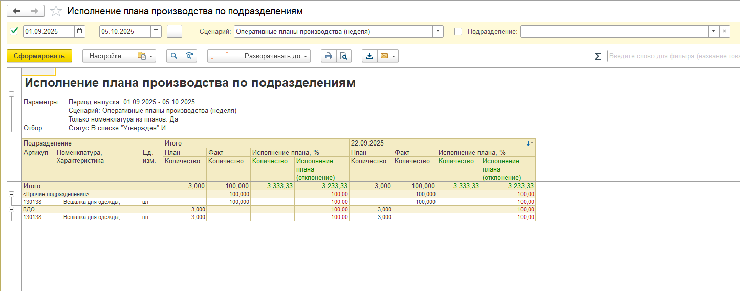 В примере выпуск был произведен по первому плану производства, по второму плану производства отклонение от исполнения так и осталось 100%.