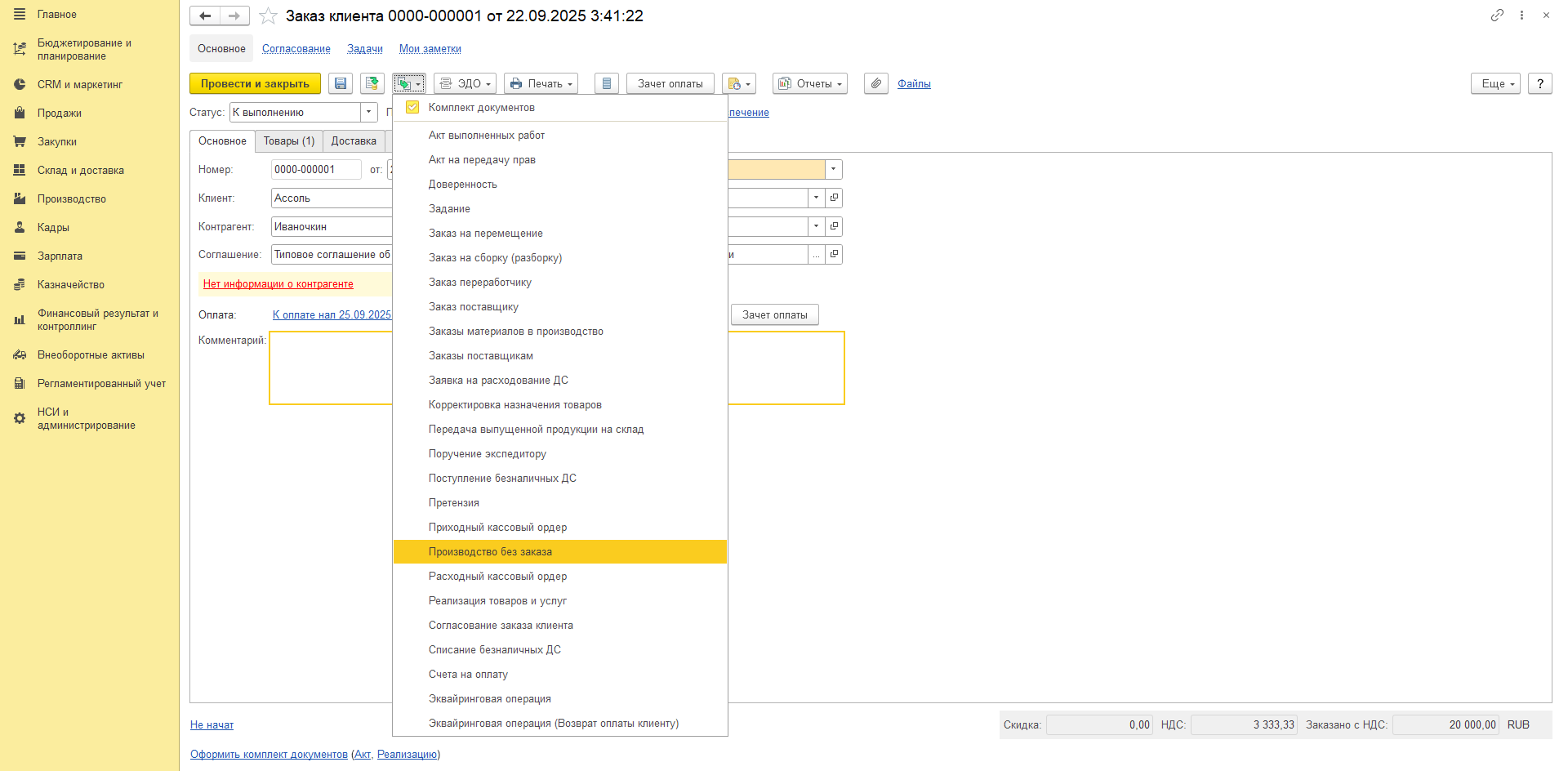 Формирование документа «Производство без заказа» на основании «Заказа клиента»