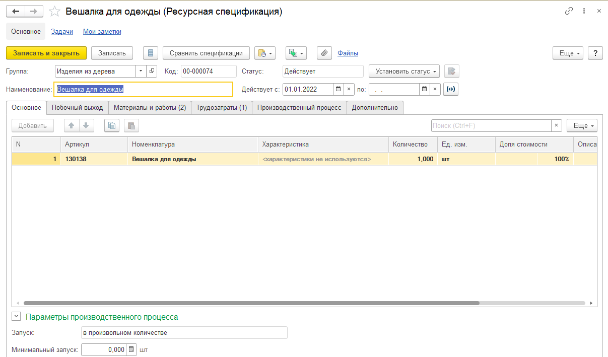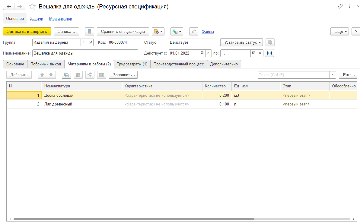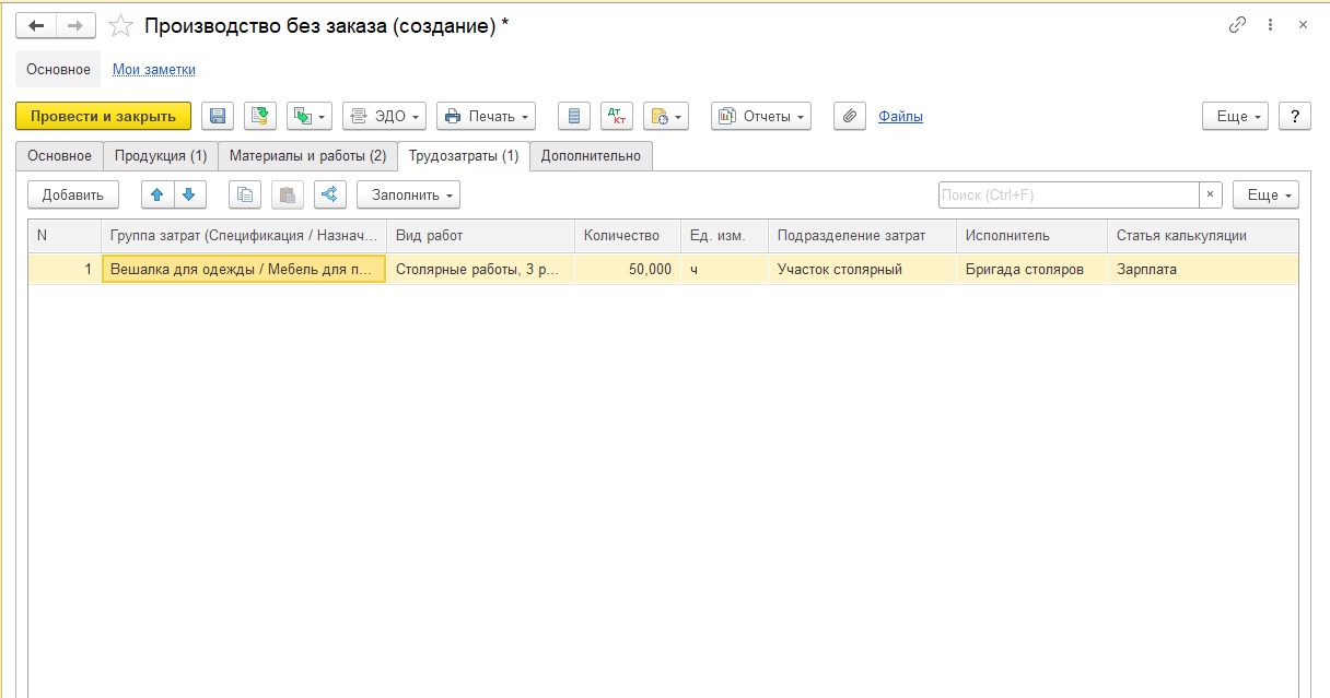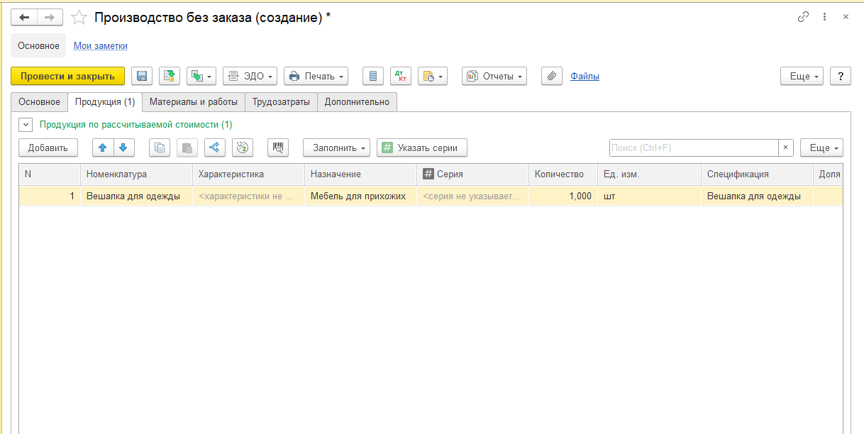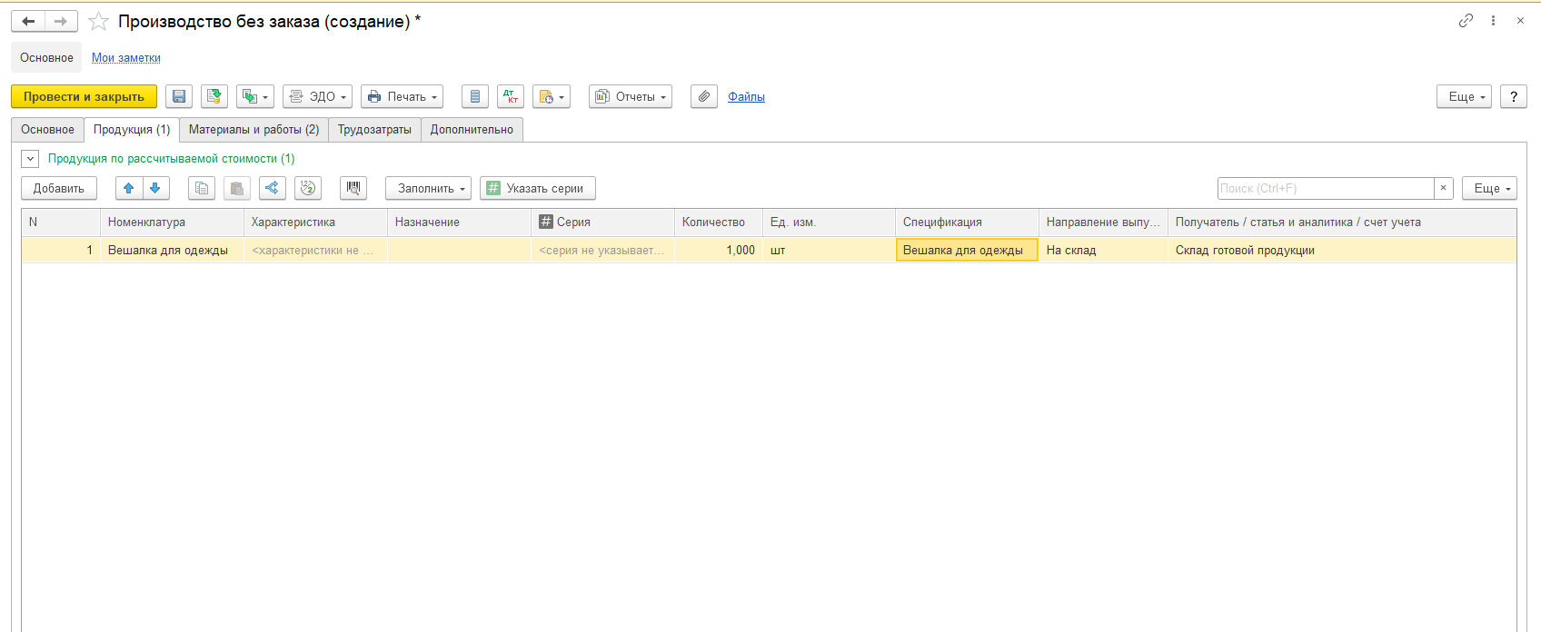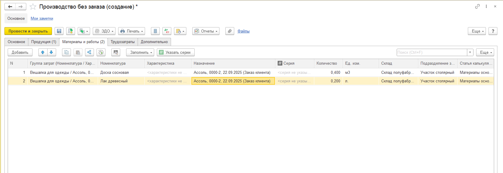 Такой функционал существенно упрощает работу в системе 1С:Комплексная автоматизация. В документ «Производство без заказа» продукция подтягивается автоматически. Заполняется и вкладка «Материалы и работы», поскольку в нашем примере указана ресурсная спецификация на эту продукцию.