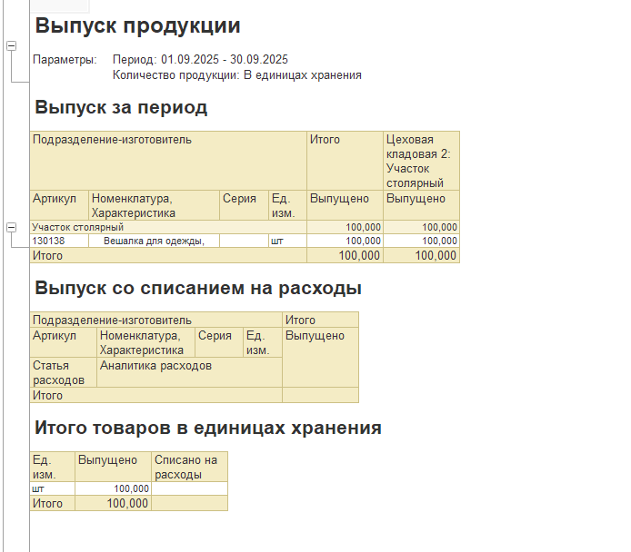 Далее после проведения документа «Производство без заказа» при условии обеспечения материалами, происходит выпуск продукции.