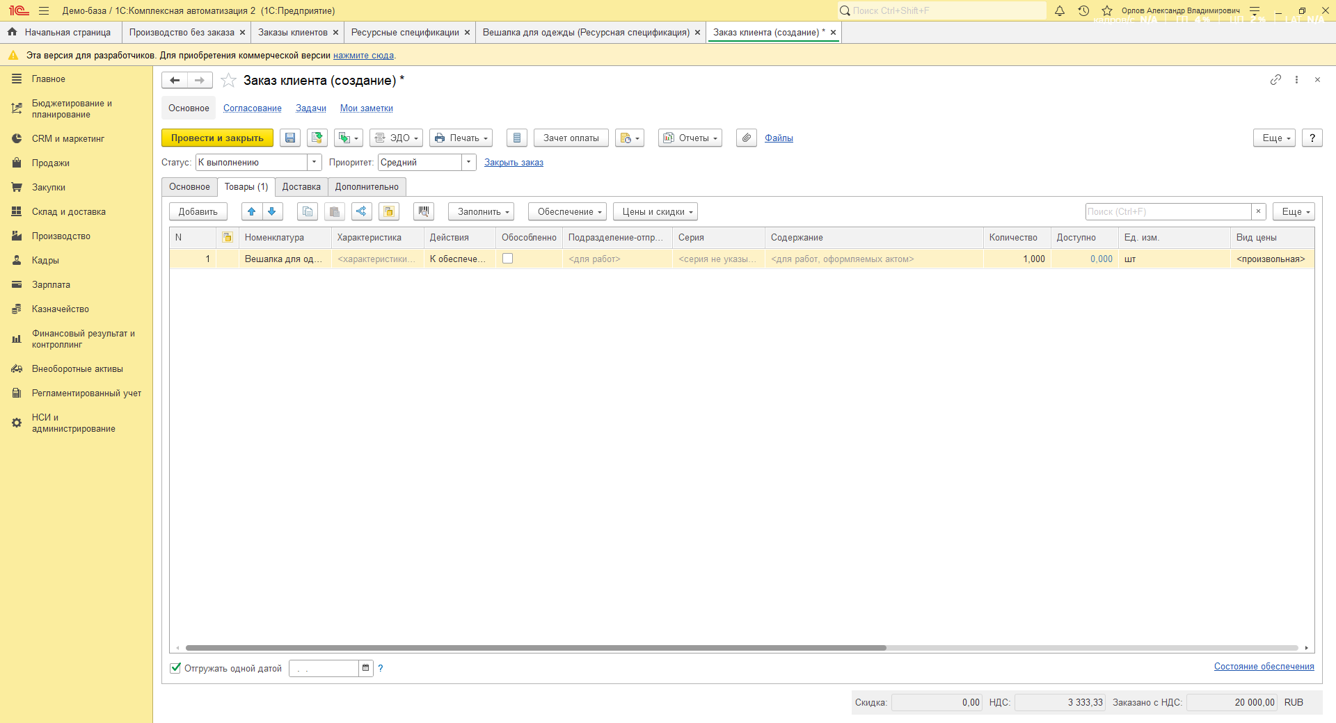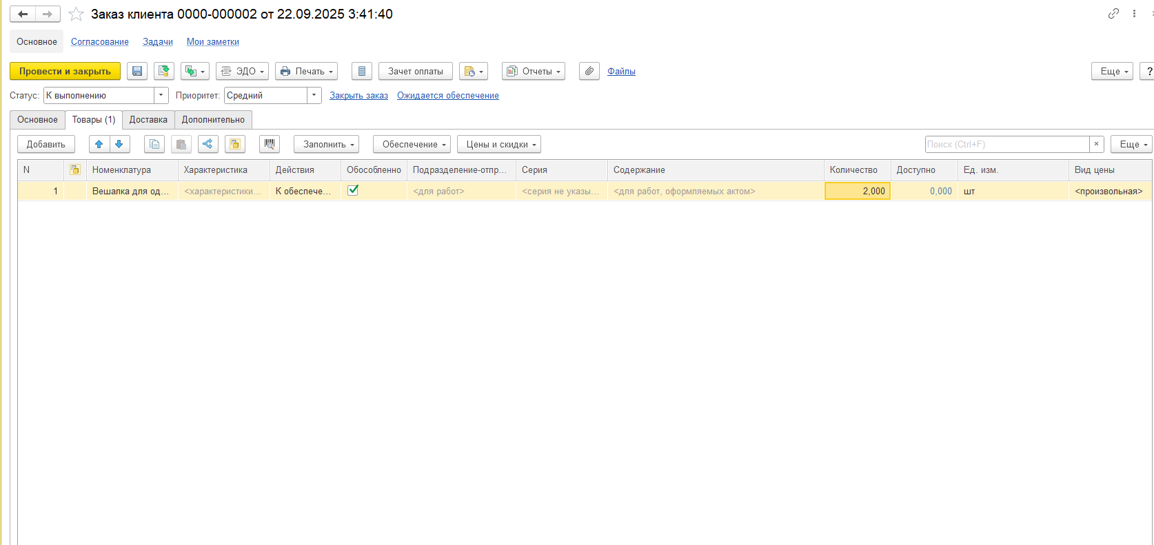 - Цепочка обеспечения: «Заказ клиента» → «Заказ материалов в производство». Далее формируются документы по закупке и передаче материалов в цех.