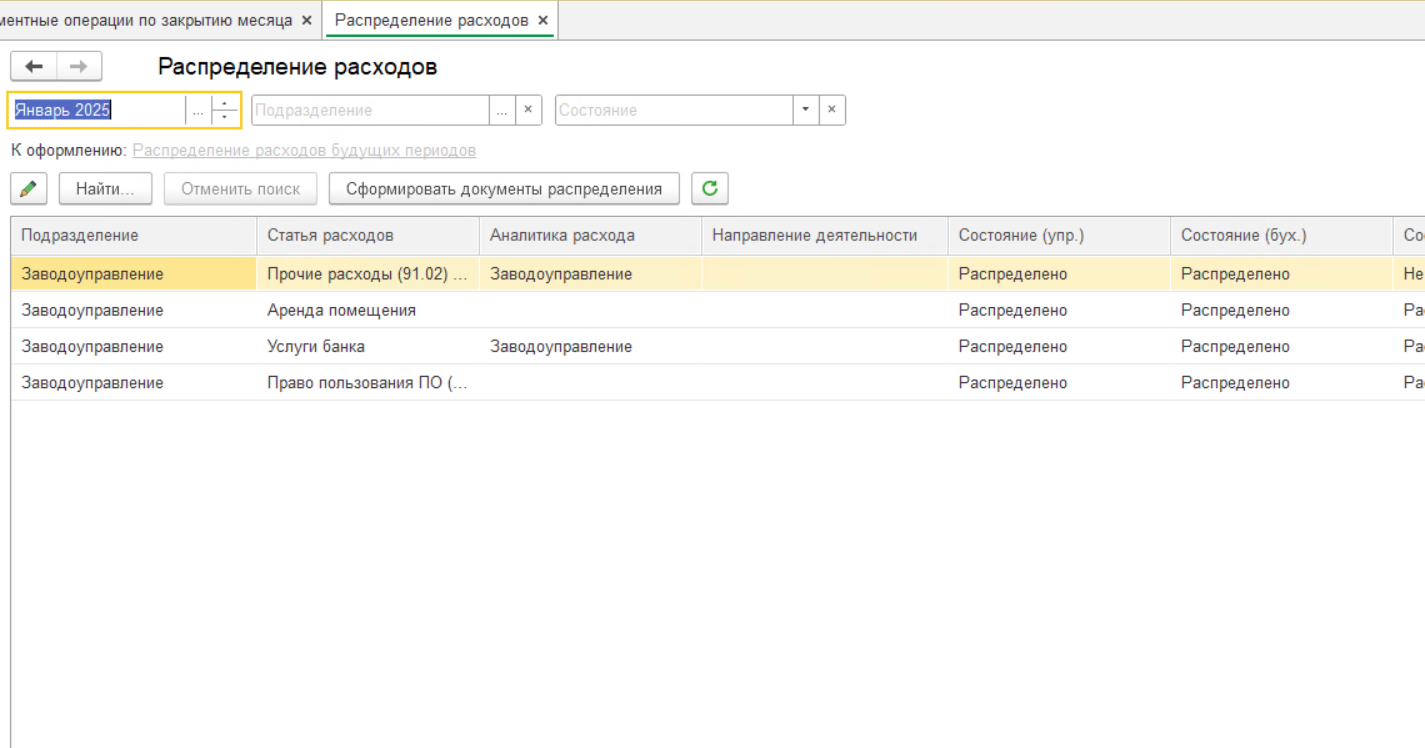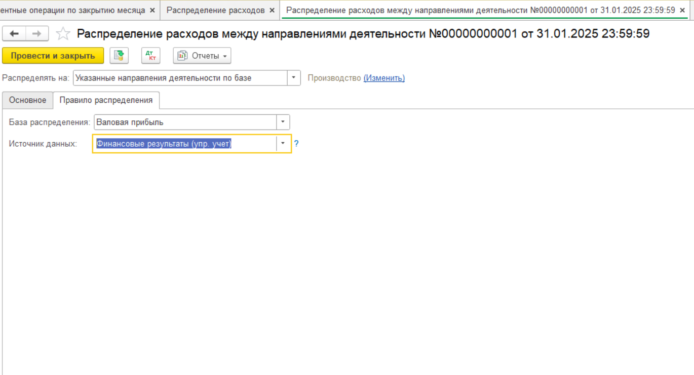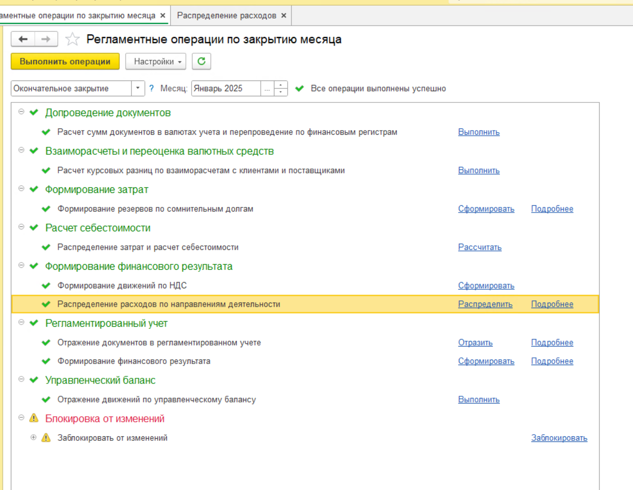 Последовательно выполнить операции закрытия месяца до Формирования финансового результата, Распределение расходов по направлениям деятельности путём нажатия кнопки Выполнить.