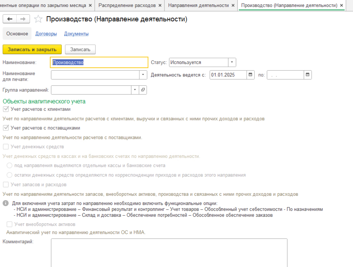 Перед Распределением расходов по направлениям деятельности необходимо завести направления деятельности в программе: Финансовый результат и контроллинг, Направления деятельности.