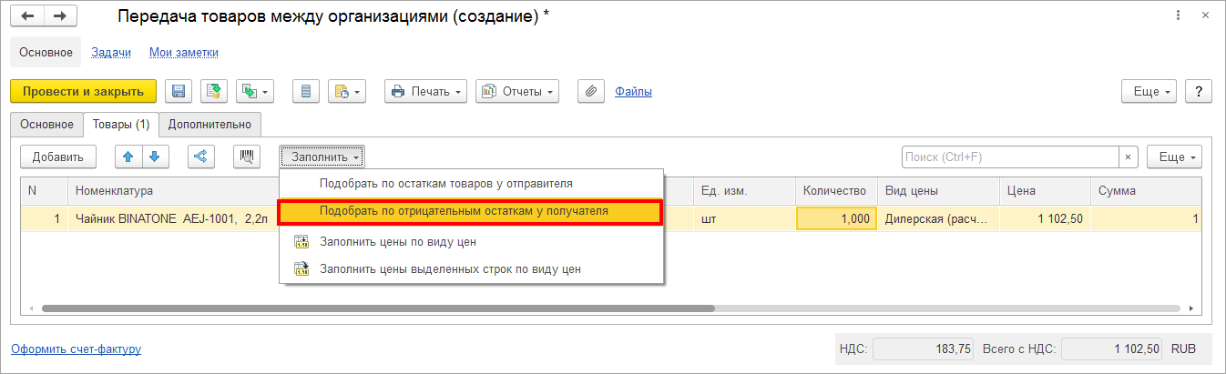 Система предоставляет инструмент автоматического подбора отрицательных остатков.