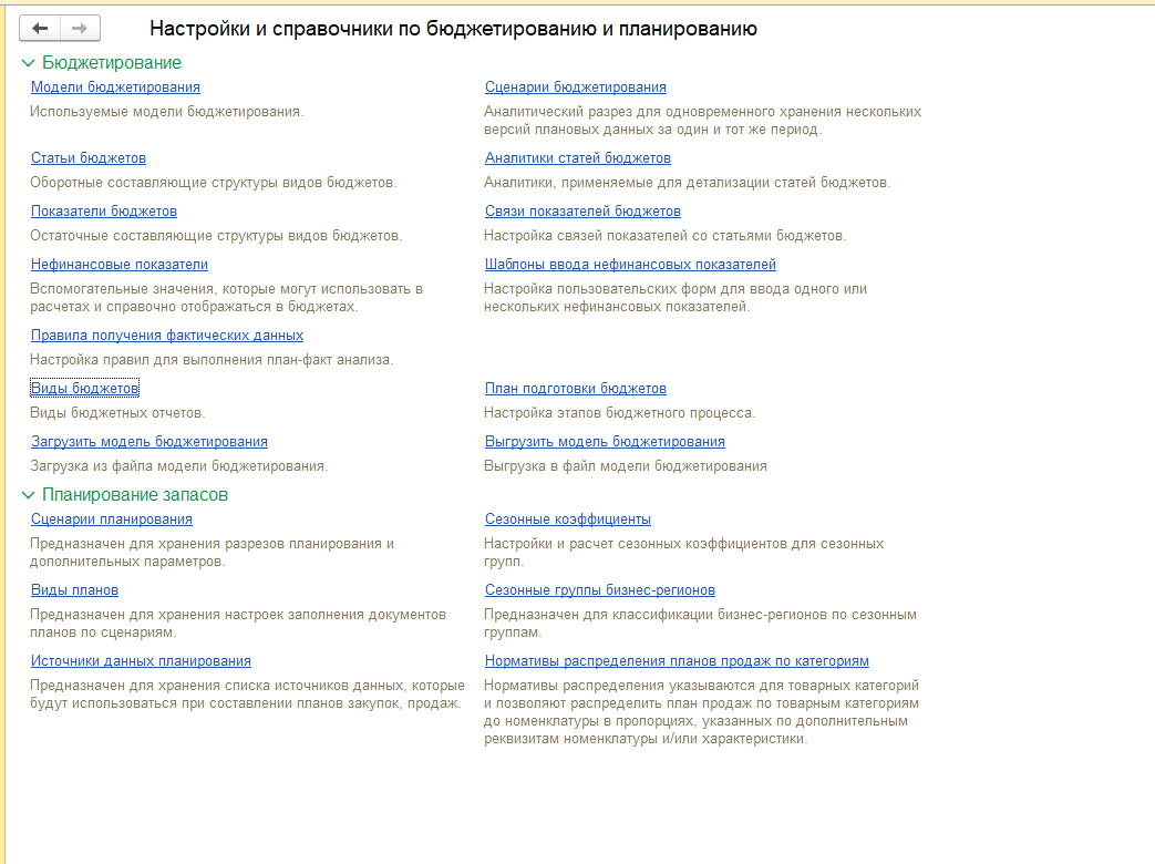 Бюджетирование и планирование → Настройка и справочники → Бюджетирование → Виды бюджетов.