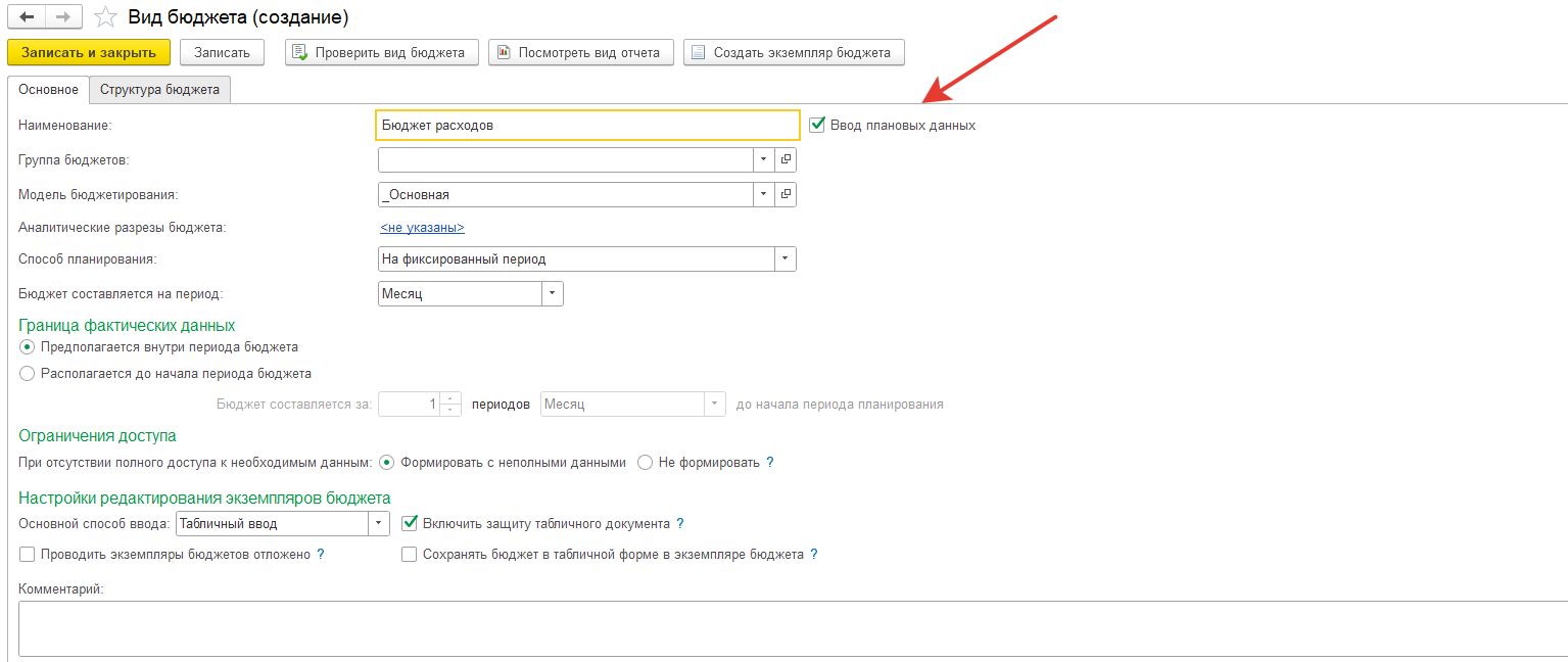 Для видов бюджета с вводом данных необходимо установить признак «Ввод плановых данных». Если форма используется для отчетов или прогнозных моделей, этот признак снимать.