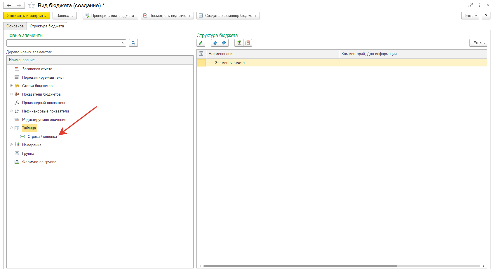 - Таблица — контейнер бюджетной формы. Содержит статьи бюджетов, показатели и аналитики. Для сложных таблиц предусмотрены отдельные элементы «Строка» и «Колонка».