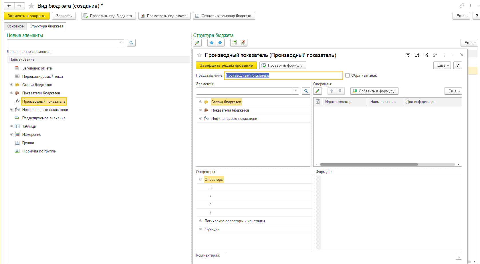 - Производные показатели — используются для создания произвольных расчетов через конструктор формул. Формулы могут включать статьи бюджетов, показатели, нефинансовые данные, функции, логические и арифметические операторы.