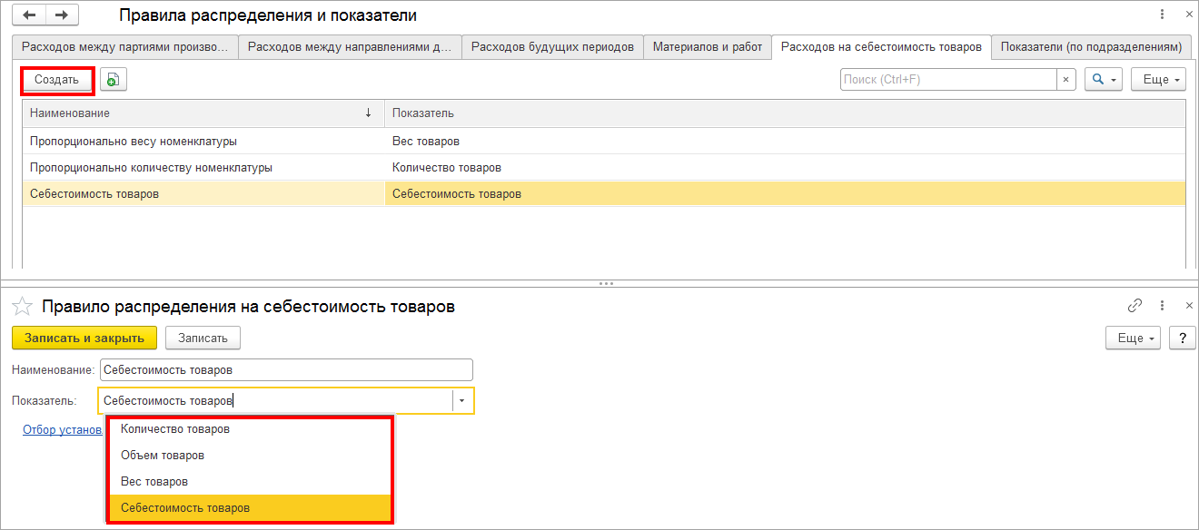 - Статью расходов с типом распределения «на себестоимость товаров»;