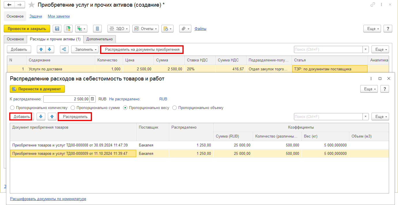Если дополнительные расходы (например, доставка) нужно распределить пропорционально весу или объёму товаров из нескольких документов поставки, используется документ «Приобретение услуг и прочих активов». Это позволяет автоматически распределить общую сумму расходов между указанными поставками.