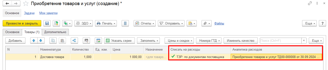Для распределения дополнительных расходов по определённому документу поставки в документе «Приобретение товаров и услуг» указываются: