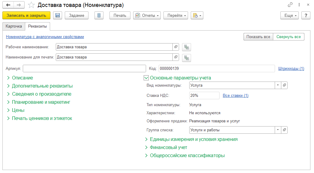 После настройки статей расходов необходимо в справочнике «Номенклатура» добавить услуги, которые могут оказываться при поступлении товаров. Например, создать номенклатурную позицию «Доставка товара». Это позволит корректно учитывать их в документах приобретения.