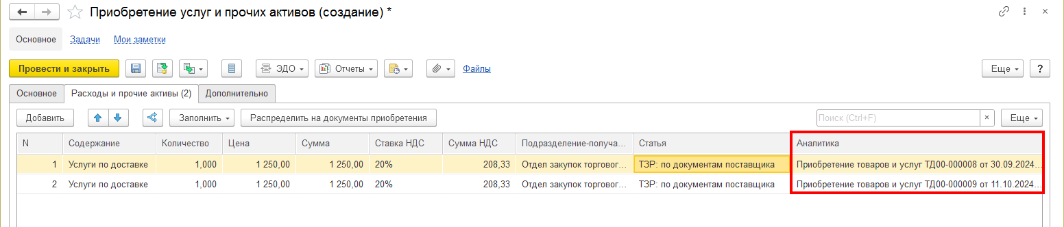 В документе «Приобретение услуг и прочих активов» будет автоматически заполнена таблица распределения с указанием: