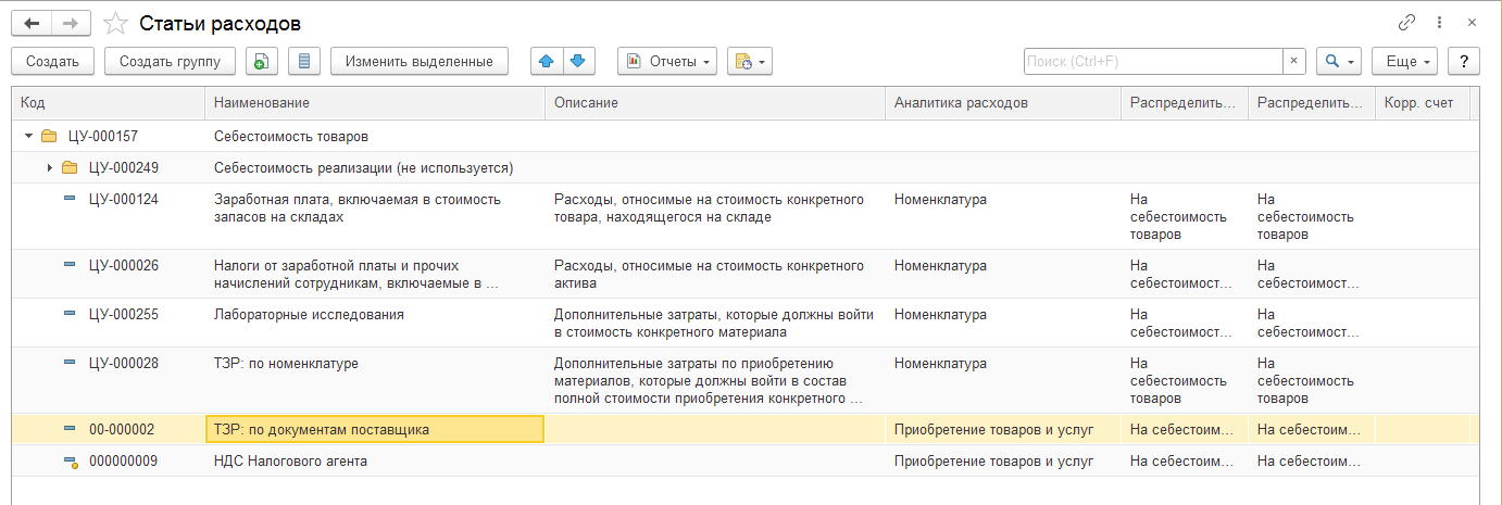 Настройка статьи расходов для распределения на себестоимость