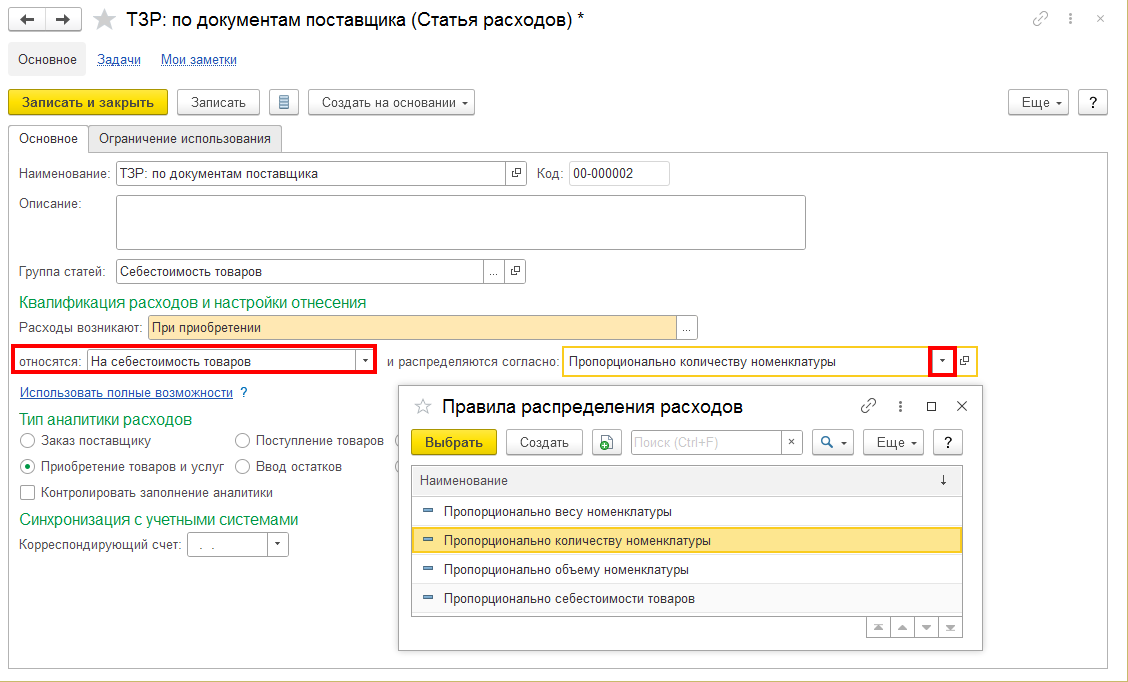 Чтобы настроить распределение дополнительных расходов на себестоимость товаров, в созданной статье расходов (например, «ТЗР: по документам поставщика») необходимо указать: