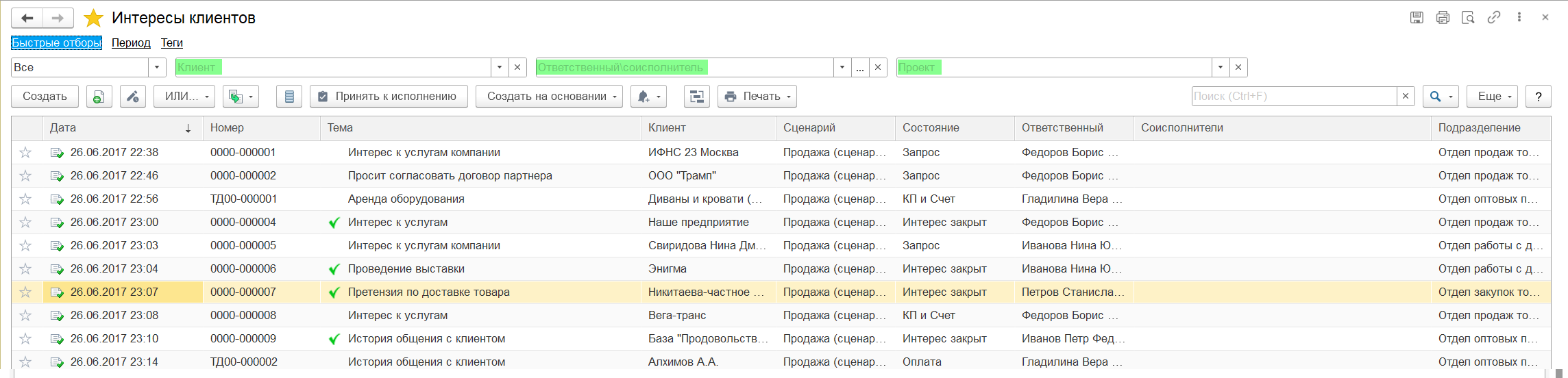 Быстрая сортировка по клиенту/сотруднику/проекту доступна в разделе Интересы клиентов.