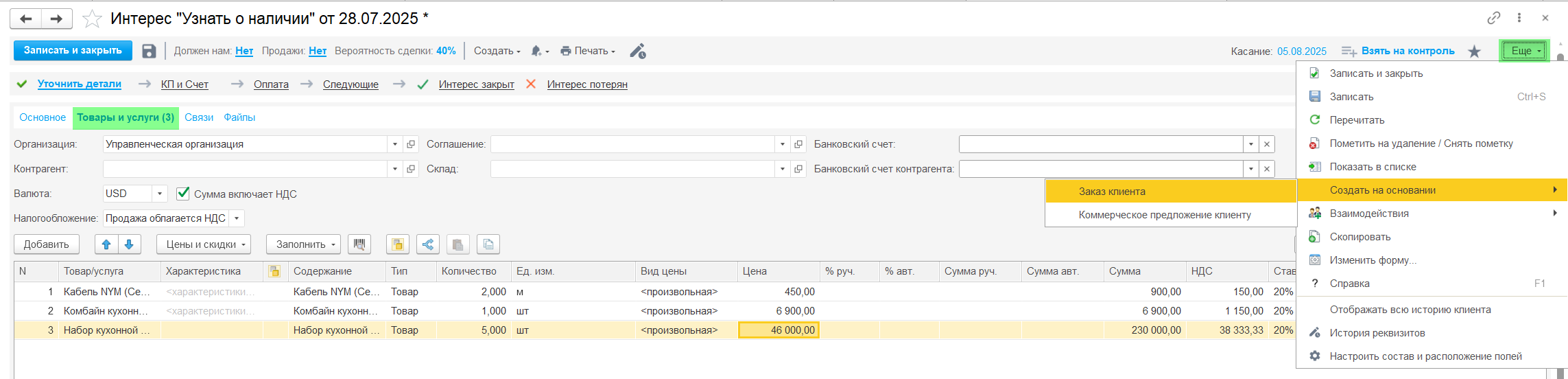- Меню из которого можно создать Заказ клиента, Коммерческое предложение, ещё один Интерес, Бизнес-процесс и Помощник продаж. Также позволяет с помощью кнопки Печать сформировать Договор, Коммерческое предложение, Счёт на оплату и даже сразу отправить адресату, используя средства 1С.